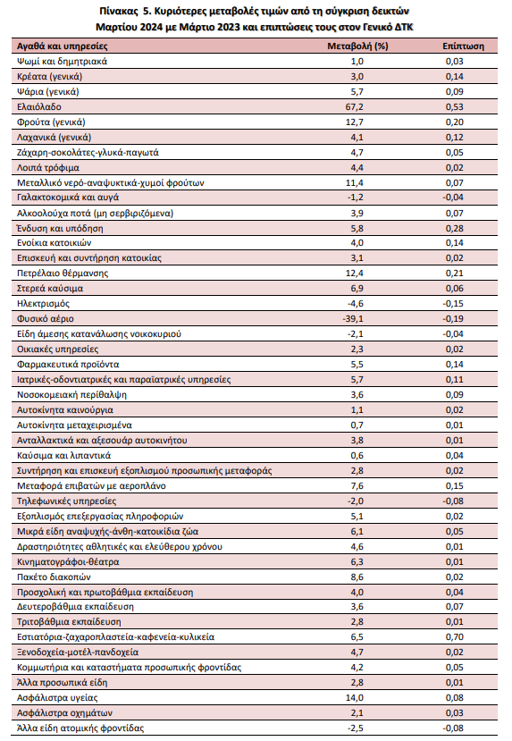Η αύξηση του Γενικού ΔΤΚ κατά 3,2% τον μήνα Μάρτιο 2024, σε σύγκριση με τον αντίστοιχο Δείκτη του Μαρτίου 2023, προήλθε κυρίως από τις μεταβολές στις ακόλουθες ομάδες αγαθών και υπηρεσιών: