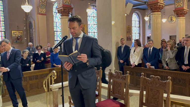 Ο Στέφανος Κασσελάκης διαβάζει το «Πιστεύω» – Πηγή φωτογραφίας: Εθνικός Κήρυκας