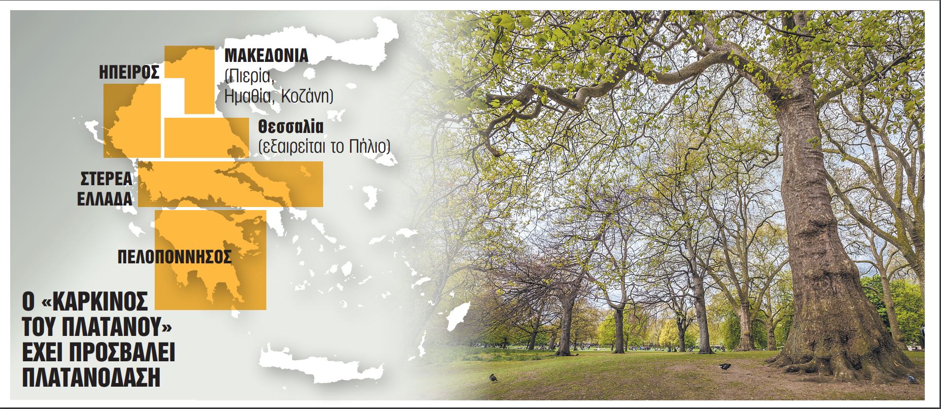 Σε διάστημα μόλις 20 ετών από τον πρώτο εντοπισμό του μύκητα στην Ελλάδα το 2004 στην περιοχή της Μεγαλόπολης, η ασθένεια έχει προσβάλει διαδοχικά όλα τα πλατανοδάση σε πολλές περιοχές της χώρας μας. Οπως επισημαίνει στα «ΝΕΑ» ο πρόεδρος του Τμήματος Δασολογίας και Φυσικού Περιβάλλοντος του ΑΠΘ, Αλέξανδρος Δημητρακόπουλος, ξεκίνησε από τα πλατάνια της Πελοποννήσου και επεκτάθηκε στην Ηπειρο, τη Στερεά Ελλάδα αλλά και τη Θεσσαλία.