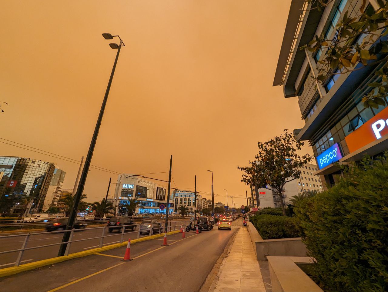 Φωτογραφίες από την Αθήνας δείχνουν τη νέα μεταφορά σωματιδίων σκόνης από τη Σαχάρα, συνθέτει ένα σχεδόν απόκοσμο σκηνικό για την πόλη, ταλαιπωρώντας λίγο ως πολύ την πλειοψηφία των πολιτών «με σημαντικές επιπτώσεις στην υγεία μέσω της υποβάθμισης της ποιότητας του αέρα», όπως έχει επισημάνει η Ελληνική Πνευμονολογική Εταιρεία (ΕΠΕ).