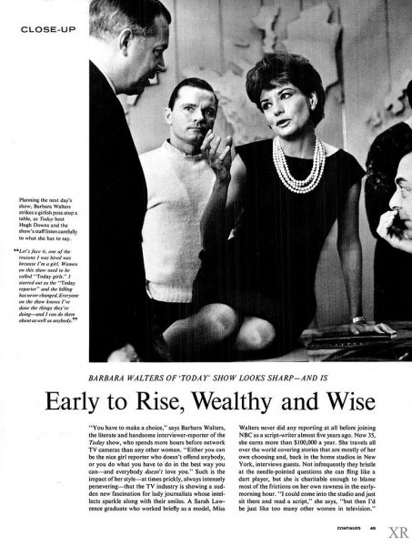 Όπως διηγείται η Σούζαν Πέιτζ στο «The Rulebreaker», τη συναρπαστική, απολαυστικά ευανάγνωστη βιογραφία της Walters, για τον Cronkite και τους άλλους γίγαντες της ραδιοτηλεοπτικής δημοσιογραφίας, η ιδέα ότι η Walters – συμπαρουσιάστρια της εκπομπής «Today» του NBC, μιας πρωινής εκπομπής που συνδύαζε τις σκληρές ειδήσεις με θέματα ανθρώπινου ενδιαφέροντος και ψυχαγωγίας – θα ανέβαινε στην πιο υψηλή θέση της τηλεοπτικής δημοσιογραφίας ήταν πέρα από κάθε όριο. Το ίδιο και ο μισθός της ύψους 1 εκατομμυρίου δολαρίων, ποσό πολύ υψηλότερο από αυτό που έπαιρνε ο Cronkite και η παρέα του.