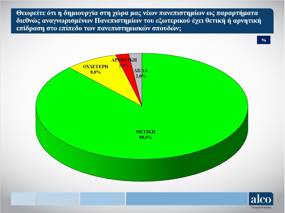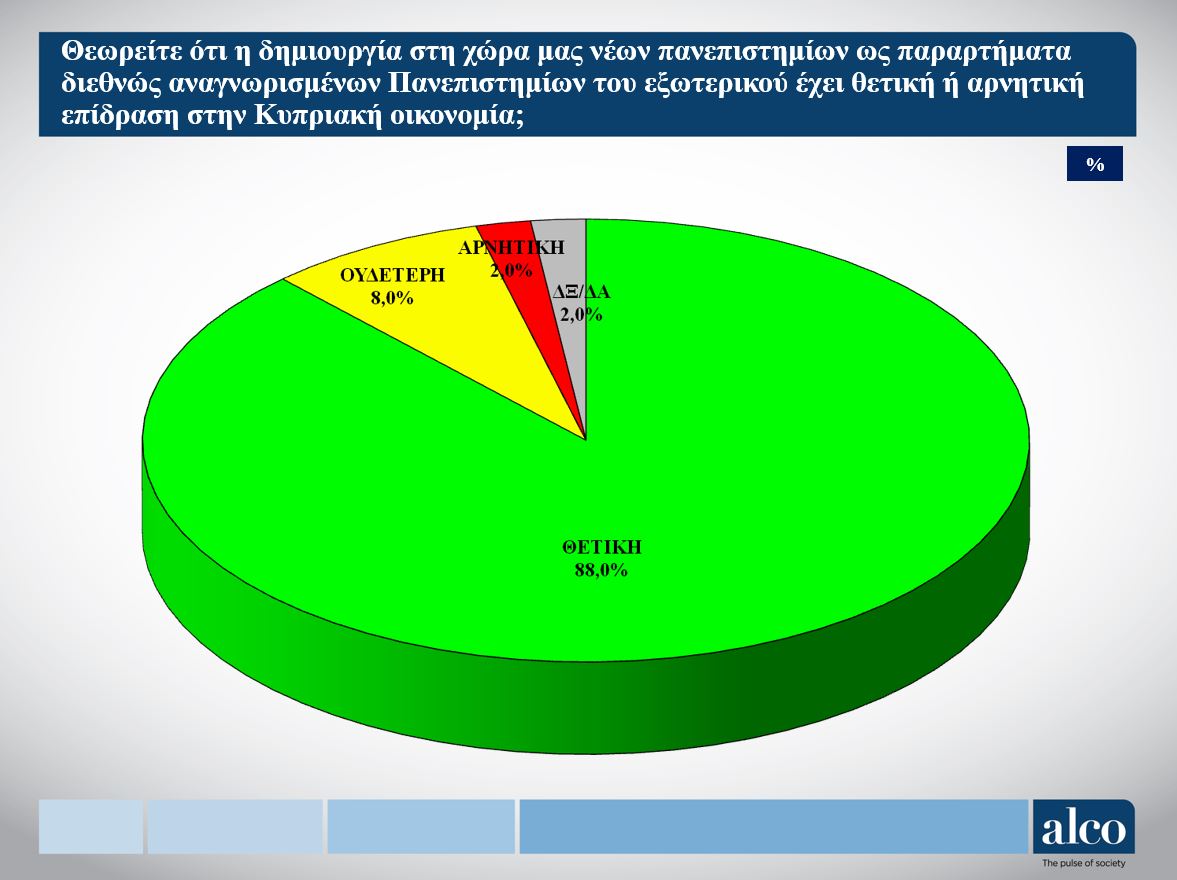 Το ίδιο θετική (88%) είναι και η πεποίθηση ότι αυτή η δημιουργία παραρτημάτων διεθνώς αναγνωρισμένων πανεπιστημίου του εξωτερικού θα έχει θετική επίδραση στην Κυπριακή οικονομία.
