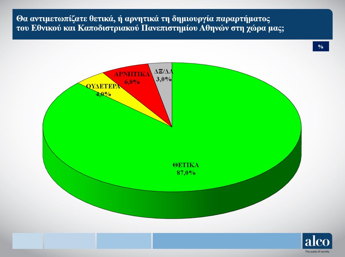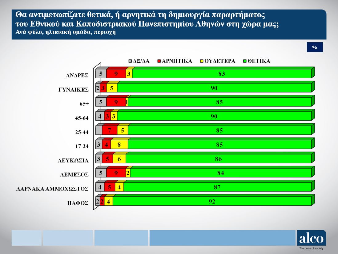 Το ίδιο υψηλά θετικά είναι η εκτίμηση και όταν το ερώτημα έρχεται στο ΕΚΠΑ και την προοπτική δημιουργίας παραρτήματός του στην Κύπρο. 87% των ερωτηθέντων τοποθετούνται θετικά και μόλις 6% τοποθετούνται αρνητικά.