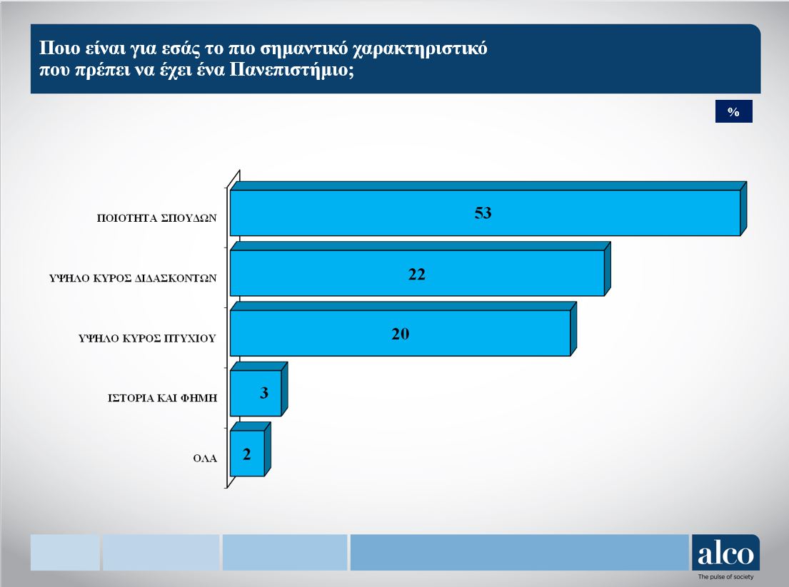 Ποιο είναι όμως το σημαντικότερο χαρακτηριστικό που κατά τη γνώμη των Κυπρίων πολιτών πρέπει να έχει ένα Πανεπιστήμιο: Εδώ οι απαντήσεις ξεκινούν από την ποιότητα των σπουδών (53%) και ακολουθούν το υψηλό κύρος των διδασκόντων (22%), το υψηλό κύρος πτυχίου (20%) και η ιστορία και φήμη (3%).