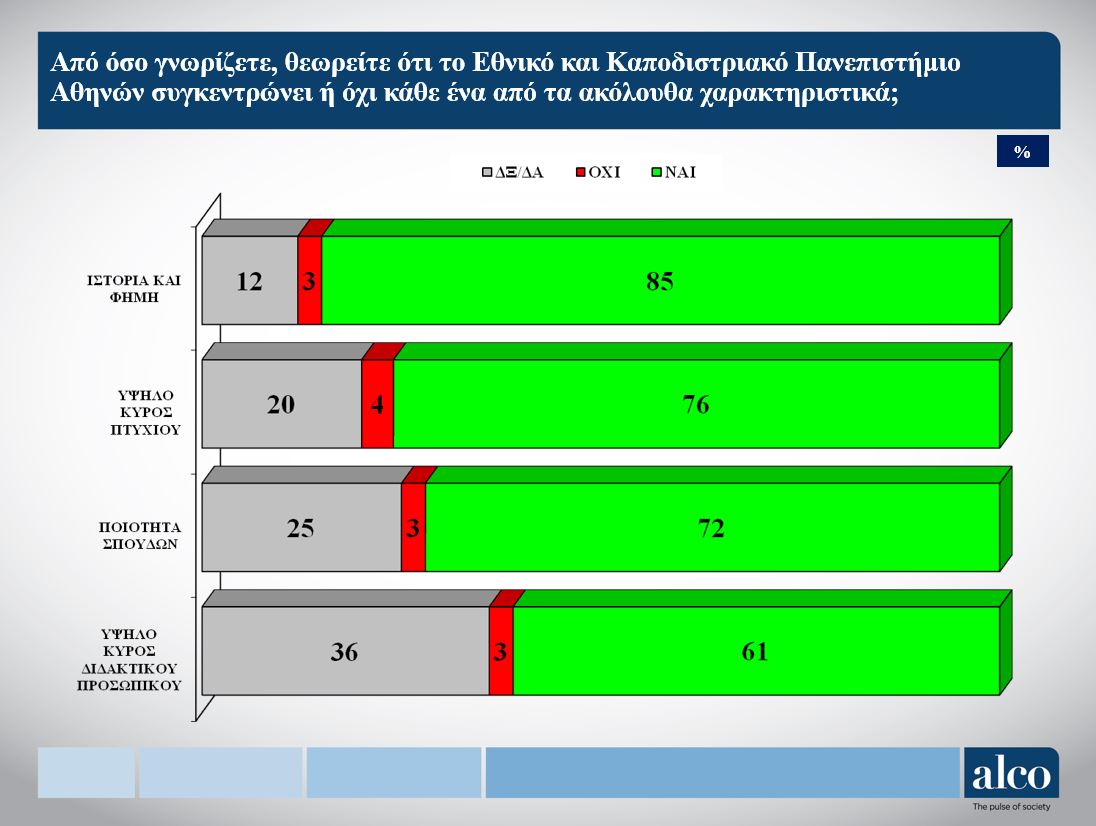 Το 85% του αναγνωρίζει ιστορία και φήμη, το 76% υψηλό κύρος πτυχίου, το 72% ποιότητα σπουδών και το 61% υψηλό κύρος διδακτικού προσωπικού. Αυτό σημαίνει ότι στο ΕΚΠΑ δεν αποδίδεται μόνο η ιστορία και η φήμη του, αλλά και όλα τα χαρακτηριστικά που όπως είδαμε στην προηγούμενη καρτέλα επιζητούν οι Κύπριοι πολίτες, δηλαδή ποιότητα σπουδών, κύρος πτυχίου και κύρος διδακτικού προσωπικού.