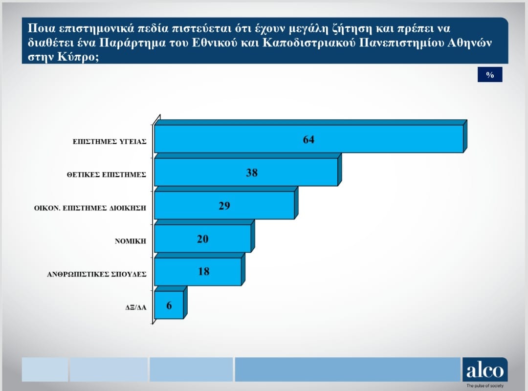 Ως προς το ποια επιστημονικά πεδία έχουν τη μεγαλύτερη ζήτηση και άρα θα πρέπει να τα διαθέτει ένα παράρτημα του ΕΚΠΑ στην Κύπρο, εδώ σαφώς προηγούνται οι Επιστήμες Υγείας, με 64% και ακολουθούν οι Θετικές Επιστήμες με 38%, οι Οικονομικές Επιστήμες και η Διοίκηση με 29%, η Νομική με 20% και οι Ανθρωπιστικές Σπουδές με 18%