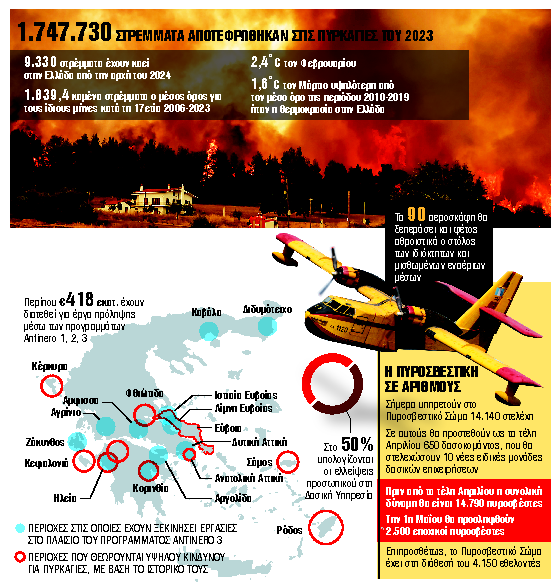 Βαριά τη σκιά της στο επερχόμενο καλοκαίρι ρίχνει η καταστροφική αντιπυρική περίοδος του 2023, χρονιά κατά την οποία αποτεφρώθηκαν συνολικά 1.747.730 στρέμματα γης και έχασαν τη ζωή τους τουλάχιστον 25 άνθρωποι. Τα πρώτα μηνύματα είναι δυσοίωνα: βάσει στοιχείων του Ευρωπαϊκού Συστήματος Πληροφοριών για τις Δασικές Πυρκαγιές (EFFIS), από την αρχή του 2024 έως τις 14 Απριλίου πυρκαγιές κατέκαψαν στην Ελλάδα 9.330 στρέμματα, τη μεγαλύτερη έκταση των τελευταίων 17 ετών για την εν λόγω περίοδο. Είναι ενδεικτικό ότι για τους ίδιους μήνες ο μέσος όρος της περιόδου 2006-2023 είναι 1.839,4 καμένα στρέμματα. Και τα μετεωρολογικά δεδομένα είναι εξόχως ανησυχητικά: τον Φεβρουάριο και τον Μάρτιο η θερμοκρασία ήταν κατά 2,4 και 1,6 βαθμούς αντίστοιχα υψηλότερη από τον μέσο όρο της περιόδου 2010-2019. Με πολλές περιοχές της χώρας να υποφέρουν από παρατεταμένη ανομβρία, το κοκτέιλ γίνεται εκρηκτικό και συνεπώς το ερώτημα γεννάται αυτόματα: Πόσο έτοιμος είναι ο κρατικός μηχανισμός;
