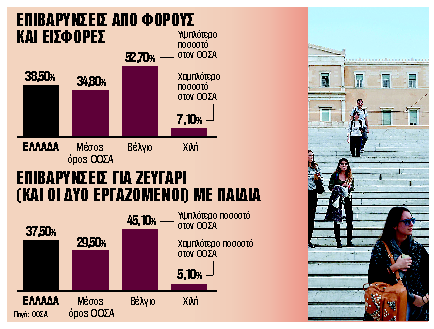 Φόροι και ασφαλιστικές εισφορές «τρώνε» το 38,5% του μισθού των εργαζομένων χωρίς παιδιά στην Ελλάδα, όταν ο μέσος όρος στις 38 χώρες του ΟΟΣΑ είναι 34,8%. Το βάρος προέρχεται κυρίως από τις ασφαλιστικές εισφορές εργαζομένου και εργοδότη που φτάνουν στο 11,3% και στο 18,2% αντίστοιχα, ενώ μόνο στο 8,9% υπολογίζεται η επιβάρυνση από τη φορολογία εισοδήματος, έναντι 13,3% που είναι ο μέσος όρος του ΟΟΣΑ. Η συνολική επιβάρυνση στη χώρα μας για τις οικογένειες με παιδιά στις οποίες εργάζονται και οι δύο γονείς είναι η 7η υψηλότερη στις χώρες του ΟΟΣΑ, καθώς ανέρχεται στο 37,5% έναντι 29,5% του μέσου όρου των χωρών του ΟΟΣΑ.