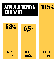 Ως προς τα ίδια τα παιδιά, η ηλικία τους εμφανίζεται να σχετίζεται με τη συχνότητα και την ποιότητα της αναγνωστικής τους πρακτικής. Η πλειονότητα των παιδιών 6-7 ετών διαβάζει για διασκέδαση (68,7%) και περιέργεια (14,3%) και μόλις 3,4% επειδή τα υποχρεώνει η οικογένειά τους. Υπάρχει όμως και ένα 6,8% που δεν διαβάζει καν. Το αντίστοιχο ποσοστό στα παιδιά 8-10 ετών μειώνεται οριακά στο 6,5%, αλλά αυξάνεται σημαντικά ο αριθμός των μικρών αναγνωστών που ισχυρίζεται ότι διαβάζει βιβλία γιατί τους αναγκάζει η οικογένειά τους (17,3%). Πάντως, το 57,3% όσων διαβάζουν στη συγκεκριμένη ηλιακή ομάδα το κάνουν για διασκέδαση και το 12,5% από περιέργεια. Σημαντική διαφοροποίηση παρατηρείται στην ομάδα των 11-12 ετών, όπου το 10,5% παραδέχεται ότι δεν διαβάζει βιβλία. Οσοι δηλώνουν όμως ότι αρέσκονται στην ανάγνωση βιβλίων, το συνηθίζουν για λόγους διασκέδασης κυρίως (45,7%) και περιέργειας (13,3%), αν και σε μεγάλο βαθμό τους το επιβάλλει η οικογένειά τους (17,1%).