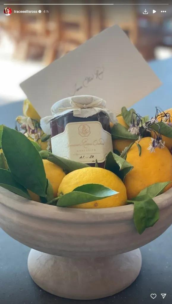 Η ηθοποιός Tracee Ellis Ross δημοσίευσε ένα στιγμιότυπο από το καλάθι με λεμόνια και το βάζο μαρμελάδας στο Instagram story της χωρίς κανένα κείμενο. Η φωτογραφία της Ross περιείχε έναν φάκελο που είχε το όνομά της γραμμένο καλλιγραφικά—πιθανώς από την ίδια τη Meghan, η οποία στο παρελθόν εργαζόταν ως καλλιγράφος.