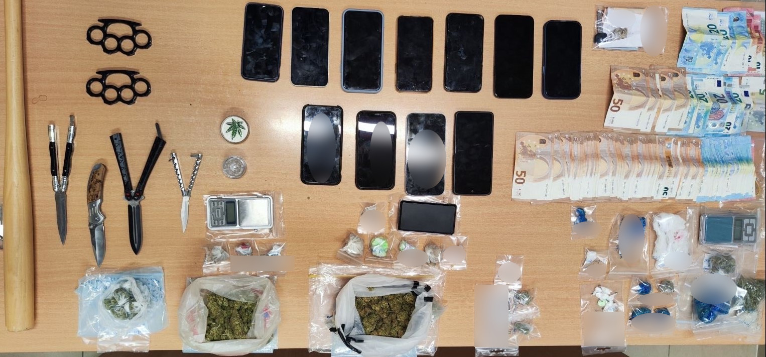 Σε έρευνες που διενεργήθηκαν στις οικίες των συλληφθέντων αλλά και σε σωματικές έρευνες οι αστυνομικοί βρήκαν και κατέσχεσαν 212,9 γραμμάρια ακατέργαστης κάνναβης, 21,8 γραμμάρια κοκαΐνης, 29,7 γραμμάρια MDMA, δύο αυτοσχέδια τσιγάρα με μίγμα κάνναβης και καπνού, τέσσερα μαχαίρια (τύπου πεταλούδα), δύο σιδερογροθιές, ένα ξύλινο μπαστούνι, τρεις ηλεκτρονικές ζυγαριές ακριβείας, δύο αυτοκίνητα και μία μοτοσικλέτα, καθώς και 4.450 ευρώ.