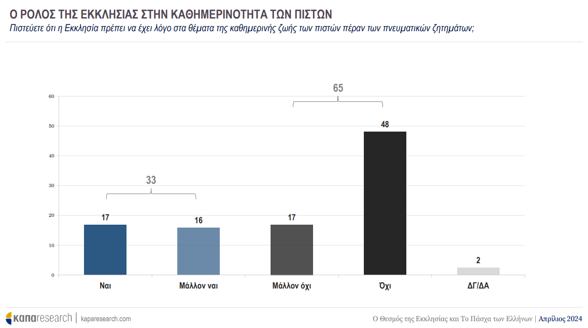 Στην ερώτηση αν η Εκκλησία πρέπει να έχει λόγο στα θέματα της καθημερινής ζωής των πιστών πέραν των πνευματικών ζητημάτων, πάνω από 6 στους 10 δίνουν αρνητική απάντηση.