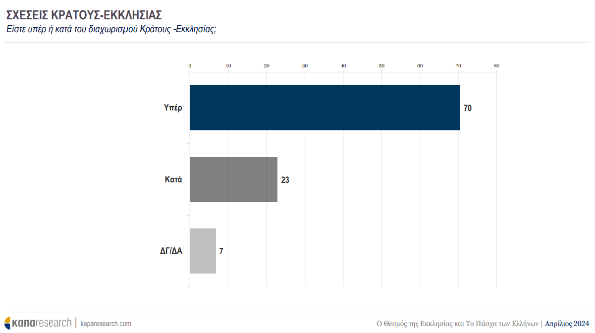 Στο μείζον ερώτημα για τις σχέσεις κράτους – εκκλησίας, ειδικά, 7 στους 10 τάσσονται υπέρ του διαχωρισμού.