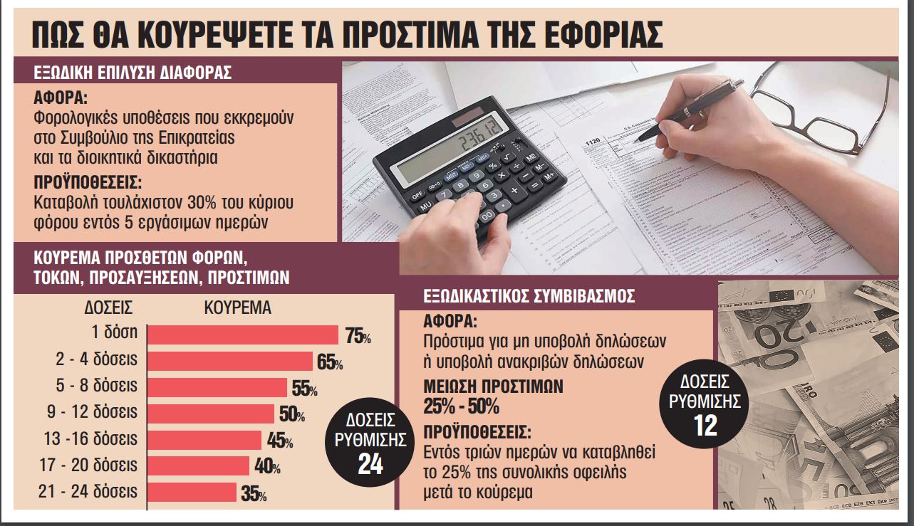 Εξωδικαστικός συμβιβασμός με κούρεμα προστίμων έως 50%. Εφόσον ο φορολογούμενος ομολογήσει παραβάσεις και αποδεχθεί την κύρια οφειλή του, τα πρόστιμα μειώνονται από 25% έως 50%. Οσο πιο γρήγορα ο φορολογούμενος συμβιβαστεί με την Eφορία τόσο πιο μεγάλη μείωση θα έχει στα πρόστιμα που θα του έχει επιβάλει ο φοροελεγκτικός μηχανισμός κατά τη διενέργεια του φορολογικού ελέγχου.