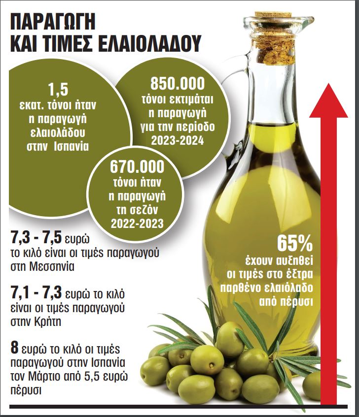 Καθοριστικό στοιχείο για την εξέλιξη των τιμών θα είναι και στη χώρα μας οι εξελίξεις της παραγωγής στην Ισπανία, η οποία αποτελεί βαρόμετρο στη διαμόρφωση των τιμών διεθνώς, αφού αποτελεί εκτός από χώρα παραγωγό και μεγάλο εισαγωγέα. Η συνολική παραγωγή ελαιολάδου στην ΕΕ εκτιμάται από την Ευρωπαϊκή Επιτροπή ότι θα ανέλθει σε 1.488.000 τόνους την περίοδο 2023-2024.