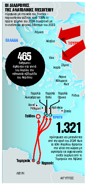 Μάλιστα, η Ανατολική Μεσόγειος, δηλαδή οι αφίξεις προς τα νησιά του Αιγαίου, κατέγραψε αύξηση 109% συγκριτικά με το αντίστοιχο χρονικό διάστημα του 2023, αποτελώντας έτσι το πιο ενεργό μονοπάτι προς την ΕΕ για παράτυπους μετανάστες το πρώτο τρίμηνο, με τον αριθμό των ανιχνεύσεων να υπερδιπλασιάζεται σε λίγο πάνω από 13.700.