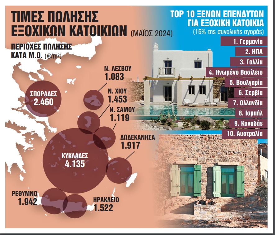 Οπως τονίζουν στελέχη της αγοράς, οι Ελληνες κινούνται σε σπίτια υψηλής αισθητικής, τα οποία πωλούνται από τα σχέδια, σε τιμές που κινούνται μεταξύ 250.000 και 350.000 ευρώ, ενώ προτιμούν περιοχές ανερχόμενες και χωρίς μεγάλη τουριστική κίνηση (π.χ. περιοχές της Κρήτης, Δυτική Ελλάδα, Κεντρική και Δυτική Ρόδος, Χίος, Σάμος, Ικαρία).