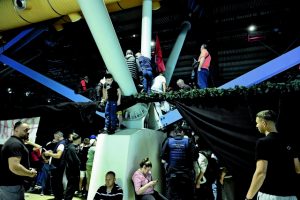 Ασφυκτικά γεμάτος ήταν χθες στο Γαλάτσι ο χώρος που επέλεξε ο Ράμα για να απευθυνθεί στο κοινό της αλβανικής διασποράς της Αθήνας. Και καθώς η κεντρική σάλα γέμισε από νωρίς με κόσμο, δεν ήταν λίγοι εκείνοι που άρχισαν να σκαρφαλώνουν σε υψηλότερα επίπεδα προκειμένου να έχουν καλύτερη θέα στη σκηνή, την ώρα που οι άνδρες της ασφάλειας του Ράμα τούς ζητούσαν να κατέβουν, καθώς επρόκειτο για ψευδοροφές από γυψοσανίδα και υπήρχε κίνδυνος ατυχήματος