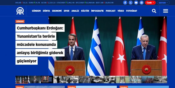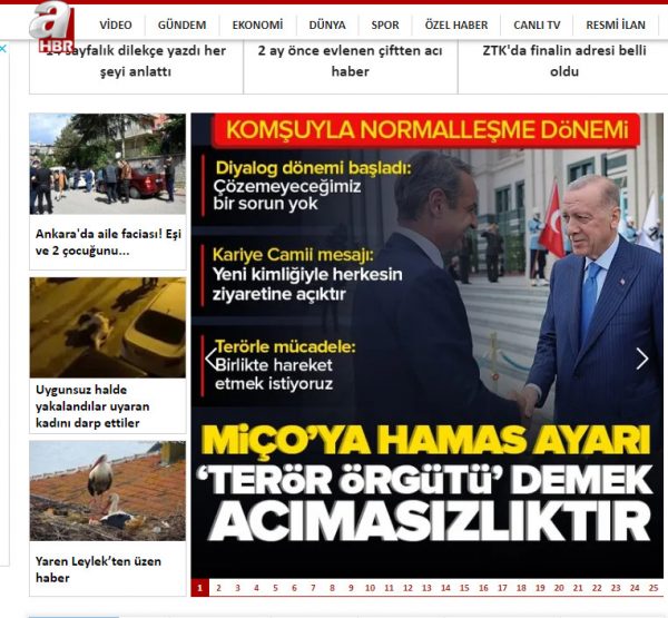 Στο Ahaber ο τίτλος είναι η απάντηση Ερντογάν στον Μητσοτάκη για το Παλαιστινιακό και πως «αν αποκαλείς την Χαμάς τρομοκρατική οργάνωση είναι αναλγησία». Στους τίτλους σημειώνεται παράλληλα η αναφορά στη Μονή της Χώρας και τη δήλωση Ερντογάν πως και ως τέμενος θα είναι ανοιχτή για επίσκεψη σε όλους, καθώς και στην δήλωση του τούρκου προέδρου πως «δεν υπάρχουν προβλήματα που δεν μπορούμε να λύσουμε».