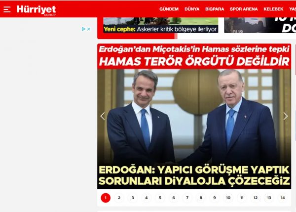 Η Hurriyet σημειώνει την απάντηση Ερντογάν στον Μητσοτάκη πως «η Χαμάς δεν είναι τρομοκρατική οργάνωση» και προσθέτει τη δήλωση του τούρκου προέδρου περί εποικοδομητικής συνάντησης και προβλημάτων που θα λυθούν με διάλογο.