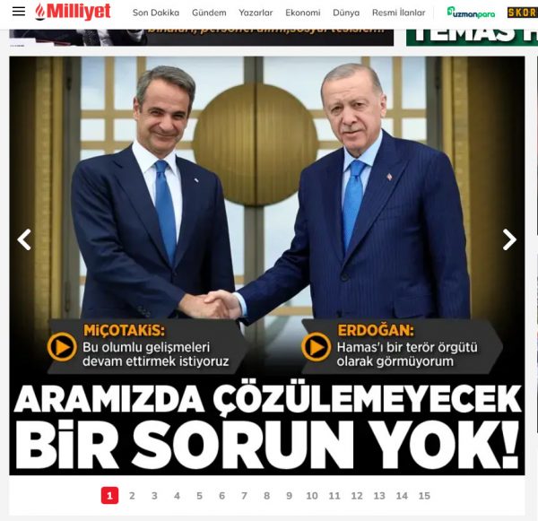 Στη Milliyet o τίτλος είναι επίσης η απάντηση Ερντογάν στον Μητσοτάκη για τη Χαμάς: «Δεν συμφωνούμε σε αυτό το θέμα». Παράλληλα υπάρχει αναφορά στις δηλώσεις των δύο ηγετών περί αξιοποίησης των ζητημάτων που υπάρχει συμφωνία και στη φράση Ερντογάν πως δεν υπάρχει θέμα που δεν μπορούμε να λύσουμε.