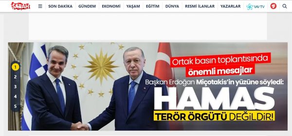 Για τη Sabah ο τίτλος είναι «ο πρόεδρος Ερντογάν απάντησε κατά πρόσωπο στο Μητσοτάκη: Η Χαμάς δεν είναι τρομοκρατική οργάνωση».