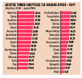 Σε ό,τι αφορά τα κυμαινόμενα τιμολόγια ρεύματος, ο δείκτης τιμών ενέργειας HEPI αποτυπώνει μια εικόνα σταθεροποίησης για την Ελλάδα συγκριτικά με τον Μάρτιο. Στο πλαίσιο αυτό, η μέση τιμή για τα νοικοκυριά ήταν 19,55 ευρώ/kWh, από 19,59 ευρώ/kWh τον Μάρτιο του 2024. Παράλληλα, το μέσο κυμαινόμενο ελληνικό τιμολόγιο ήταν τον Απρίλιο το 12ο φθηνότερο, όπως και τον Μάρτιο, ενώ οι τρεις ακριβότερες ευρωπαϊκές πρωτεύουσες τον προηγούμενο μήνα ήταν το Βερολίνο (40,59 ευρώ/kWh), το Δουβλίνο (37,79 ευρώ/kWh) και το Λονδίνο (36,91 ευρώ/kWh).