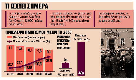 Σε ό,τι αφορά τα όρια ηλικίας συνταξιοδότησης, σύμφωνα με το πιθανότερο σενάριο των ειδικών της κοινωνικής ασφάλισης, αναμένεται μικρή (κατά 1,5 έτος) και σταδιακή, από το 2027 έως το 2030, ενδεχόμενη αύξηση των γενικών ορίων ηλικίας συνταξιοδότησης λόγω της πίεσης που ασκεί το δημογραφικό και η γήρανση του πληθυσμού. Οι διεθνείς οργανισμοί εκτιμούν ότι το 2030 η χώρα μας θα πρέπει να το αυξήσει κατά ενάμισι έτος στα 68,5 έτη για την πλήρη, ενώ για την πρόωρη συνταξιοδότηση κατά ένα έτος και τρεις μήνες, στα 63,5 έτη.
