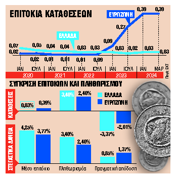 Στην περίπτωση της Ελλάδας, το μέσο επιτόκιο στις απλές καταθέσεις είναι 0,03%. Με τον εναρμονισμένο πληθωρισμό στο 3,40%, ο καταθέτης χάνει 3,37% από την αγοραστική δύναμη που έχει στην τράπεζα. Αντίστοιχα, με μέσο επιτόκιο κατάθεσης στην ευρωζώνη 0,39% και με πληθωρισμό 2,40%, η πραγματική απόδοση είναι επίσης αρνητική, αλλά μικρότερη από ό,τι στην Ελλάδα. Αυτό συμβαίνει διότι στην ευρωζώνη υπάρχουν υψηλότερα επιτόκια καταθέσεων (0,39% κατά μέσο όρο, έναντι 0,03% στην Ελλάδα). Επίσης, στην ευρωζώνη ο πληθωρισμός είναι χαμηλότερος κατά μία ποσοστιαία μονάδα (2,40% από 3,40% στην Ελλάδα).