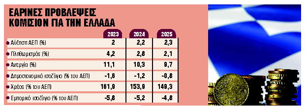 Οριακά προς τα κάτω αναθεώρησε την εκτίμησή της η Ευρωπαϊκή Επιτροπή για την ανάπτυξη της ελληνικής οικονομίας το 2024 στις εαρινές της προβλέψεις. Η Κομισιόν προβλέπει ότι η ανάπτυξη θα περιοριστεί στο 2,2% το 2024 (προηγούμενη πρόβλεψη: 2,3%), ενώ διατήρησε την πρόβλεψή της για το 2025 στο 2,3%. Οπως επισημαίνει η έκθεση της Κομισιόν για την Ελλάδα, η ανάπτυξη του ΑΕΠ προβλέπεται να σημειώσει μικρή βελτίωση φέτος και του χρόνου, υποστηριζόμενη από τις εξαγωγές, τις επενδύσεις και την ιδιωτική κατανάλωση.
