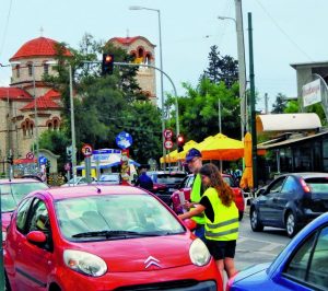 Ολα εξελίσσονται με ακρίβεια και μεγάλη προσοχή. Η καλά οργανωμένη ομάδα «Οδικής Ασφάλειας» του 1ου ΓΕΛ Νέας Φιλαδέλφειας έχει πάρει θέση (φορώντας φωσφοριζέ γιλέκα) στο φανάρι Δεκελείας και Φωκών. Η Αγγελική Φουρκιώτη χρονομετρά – 40 δεύτερα διαρκεί το κόκκινο φανάρι, τόσο χρόνο έχουν ο συντονιστής εκπαιδευτικός Βαγγέλης Δήμας, κρατώντας ένα χαρτόνι που γράφει «ΔΡΑΣΗ ΓΙΑ ΤΗΝ ΟΔΙΚΗ ΑΣΦΑΛΕΙΑ», και η Βασιλίνα Πολυχρονοπούλου που τον ακολουθεί να μοιράσουν τα μηνύματά τους: «Φίλε οδηγέ, τους πεζούς και τα μάτια σου! Στον φωτεινό σηματοδότη όταν ανάψει πράσινο θα εμφανιστούν κίτρινα βελάκια που αναβοσβήνουν, άρα αν στρίψεις αριστερά οφείλεις – σύμφωνα με τον ΚΟΚ – να προχωρήσεις με προσοχή και να παραχωρήσεις προτεραιότητα στους πεζούς. Ευχαριστούμε». Πριν λήξει ο χρόνος, η Αγγελική τους ειδοποιεί να επιστρέψουν στο πεζοδρόμιο.