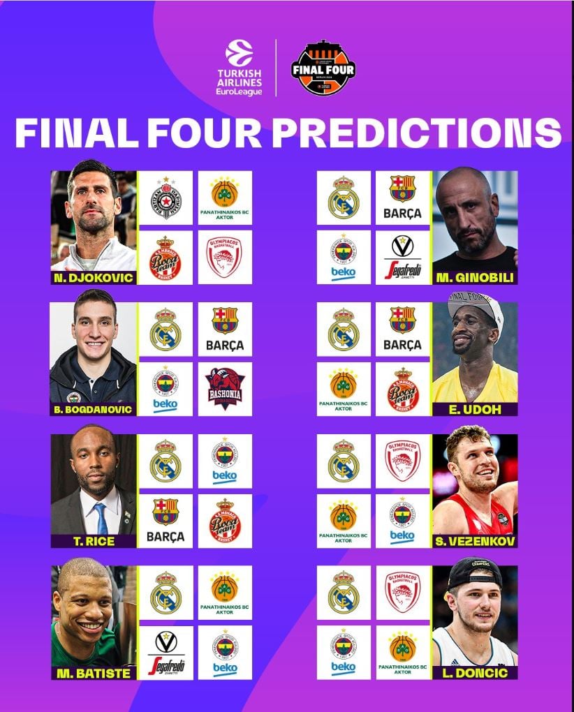 Πόσοι, όμως, από όσους έκαναν προβλέψεις στην ιστοσελίδα της Euroleague πριν τα παιχνίδια των playoffs πέτυχαν την τετράδα του Final-4; Μόλις δύο στους οκτώ. Μόνο οι Σάσα Βεζένκοφ και Λούκα Ντόντσιτς πήγαν στο ταμείο. Οι Νόβακ Τζόκοβιτς, Μπόγκνταν Μπογκντάνοβιτς, Ταϊρίς Ράις, Μάικ Μπατίστ, Μανού Τζινόμπιλι και Έκπε Ούντοχ πήγαν… κουβά.
