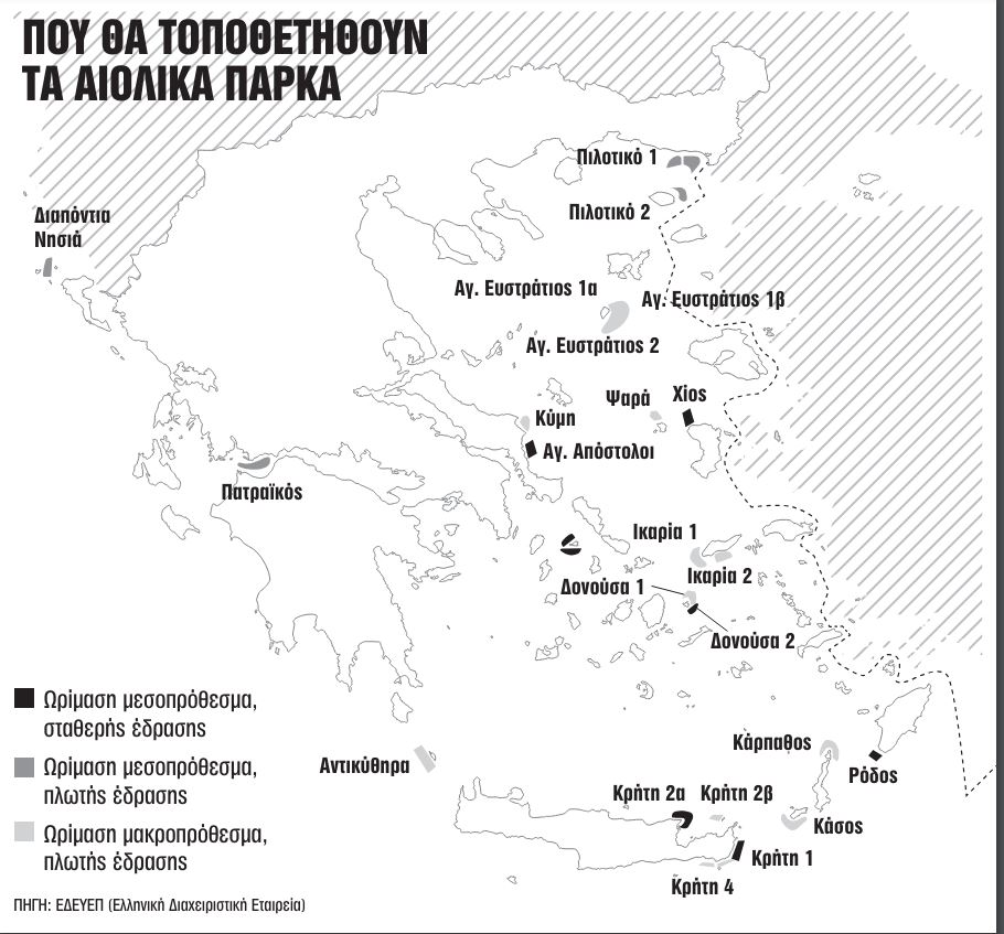 Εξάλλου, πρόσφατα, η Ελληνική Διαχειριστική Εταιρεία Υδρογονανθράκων και Ενεργειακών Πόρων (ΕΔΕΥΕΠ) ανέφερε ότι 25 περιοχές σε όλη την Ελλάδα μπορούν δυνητικά να εξελιχθούν σε περιοχές οργανωμένης ανάπτυξης υπεράκτιων αιολικών πάρκων. Αυτές οι περιοχές καλύπτουν έκταση 2.712 τετραγωνικών χιλιομέτρων και με μια σχετικά συντηρητική, ασφαλή εκτίμηση θα μπορούσαν να φιλοξενήσουν αιολικό δυναμικό της τάξεως των 12,4 GW.