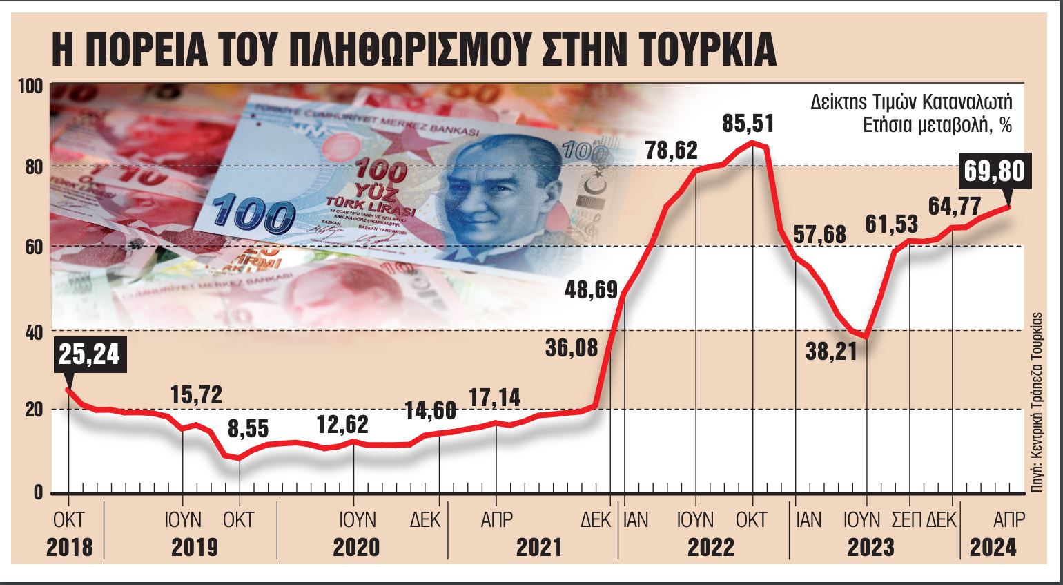 Με τον πληθωρισμό να τρέχει σε ετήσια βάση με σχεδόν 70%, η Κεντρική Τράπεζα της Τουρκίας έχει αυξήσει το βασικό επιτόκιο δανεισμού σε λίρες Τουρκίας από το 8,5% στο 50%. Το μέγιστο μηνιαίο επιτόκιο για τις πιστωτικές κάρτες, που χρησιμοποιούν όλο και περισσότεροι καταναλωτές για να καλύψουν ανάγκες, έχει τριπλασιαστεί από τον περασμένο Ιούνιο και διαμορφώνεται πλέον σε 4,25% όπως δείχνουν στοιχεία των «Financial Times».