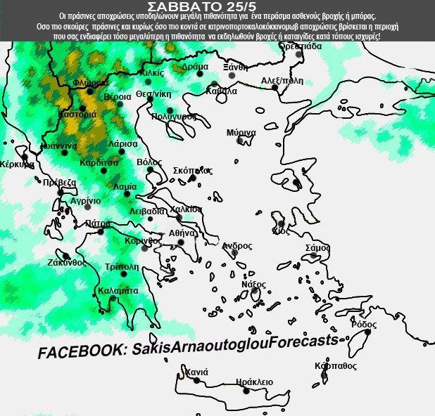 Όπως διευκρινίζει αναφορικά με τους χάρτες που παραθέτει, οι πράσινες αποχρώσεις υποδηλώνουν μεγάλη πιθανότητα για ένα πέρασμα βροχής ή μπόρας. Όσο πιο σκούρες πράσινες και κυρίως όσο πιο κοντά σε κιτρινοπορτοκαλοκόκκινομωβ αποχρώσεις βρίσκεται η περιοχή, τόσο μεγαλύτερη η πιθανότητα να εκδηλωθούν βροχές ή καταιγίδες κατά τόπους ισχυρές.