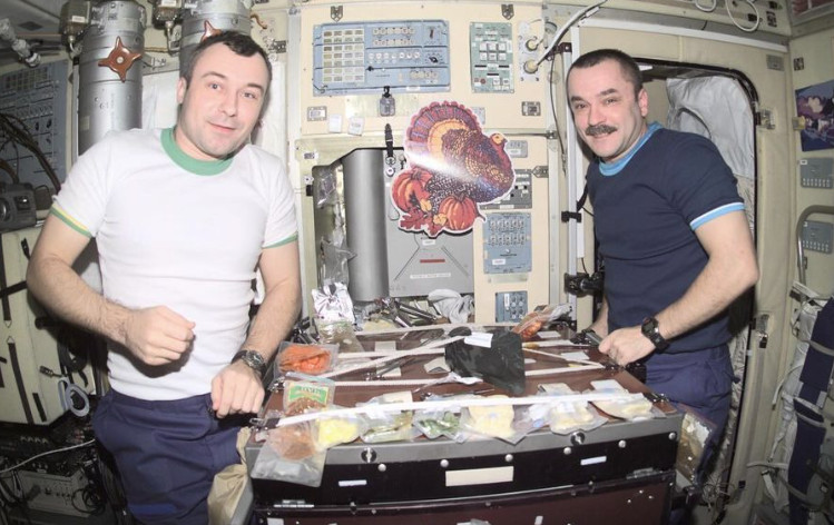 Μέλη του πληρώματος της Expedition 3 τρώνε ένα γεύμα σε ένα αυτοσχέδιο τραπέζι στον διαστημικό σταθμό το 2001. Μια χάρτινη γαλοπούλα βρίσκεται στον τοίχο πίσω τους. Πηγή φωτό: nasa – intsagram