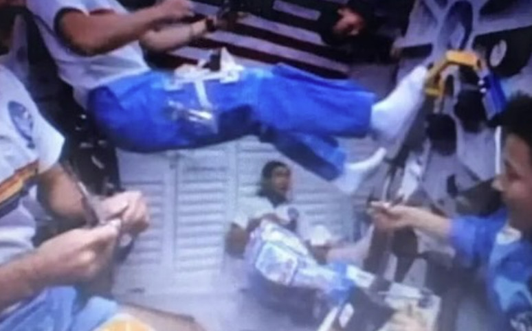 Πέντε αστροναύτες στο μεσαίο κατάστρωμα του διαστημικού λεωφορείου Atlantis. Τρώνε γεύματα της Ημέρας των Ευχαριστιών από μικρούς δίσκους. Μια αμερικανική σημαία βρίσκεται στον τοίχο πίσω τους. Πηγή φωτό: nasa – intsagram