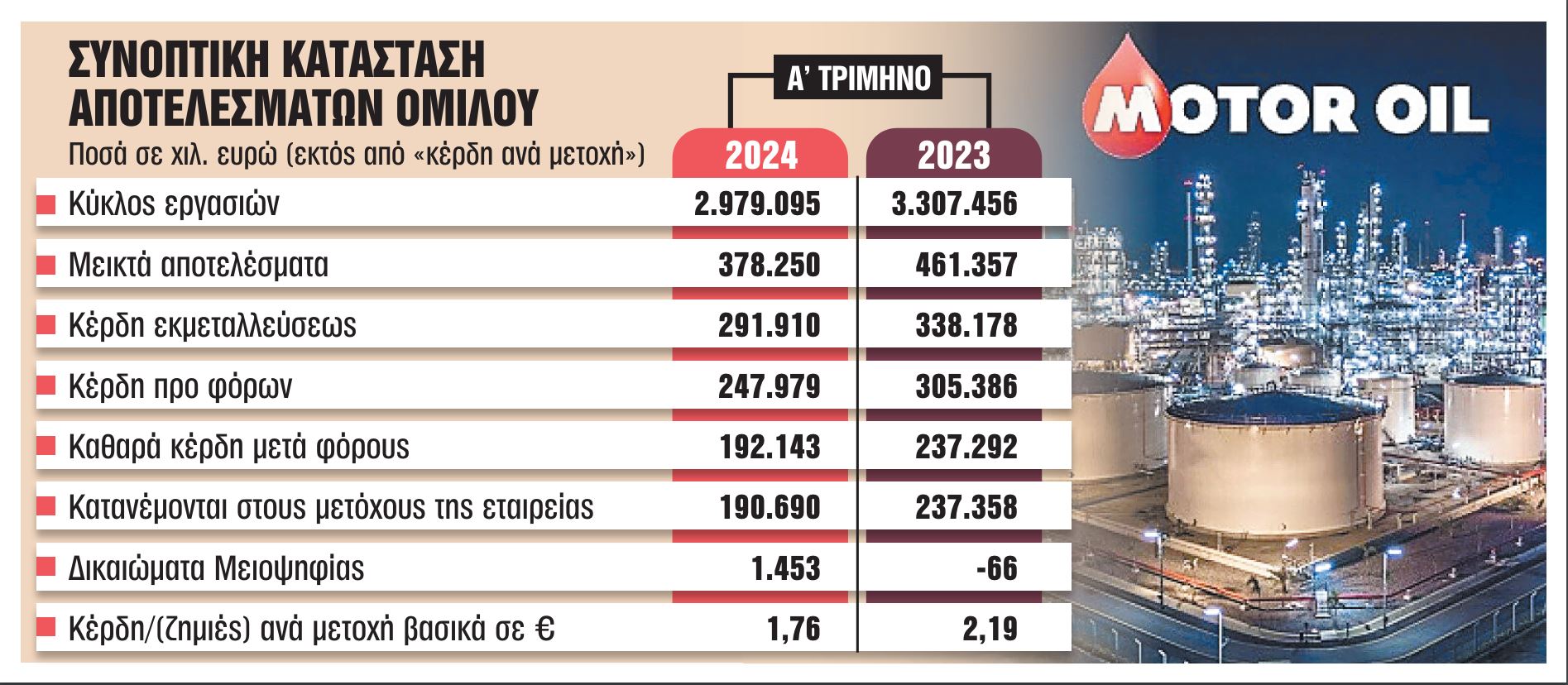 Στο πρώτο τρίμηνο του 2024 οι πωλήσεις του ομίλου διαμορφώθηκαν στα 3 δισ. ευρώ και ήταν μειωμένες κατά 10% σε σχέση με το πρώτο τρίμηνο του 2023. Η μείωση των περιθωρίων κέρδους στη διεθνή αγορά των πετρελαιοειδών δεν άφησε ανεπηρέαστα τα οικονομικά μεγέθη της Motor Oil. Ωστόσο, ο όμιλος, λόγω της διαχείρισης του ενεργειακού χαρτοφυλακίου καθώς και των τεχνικών δυνατοτήτων των μονάδων διύλισης, παρουσίασε ιδιαίτερη ανθεκτικότητα.