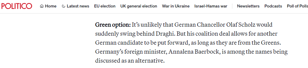 «Και δεν είναι μόνος σε αυτό: ακόμη και ο καγκελάριος Όλαφ Σολτς δυσανασχετεί με την κυρία φον ντερ Λάιεν, επειδή εκείνη φλερτάρει με την δεξιά ιταλική κυβέρνηση της Τζόρτζια Μελόνι πριν από τις εκλογές. Ο κ. Σολτς θα μπορούσε να αφήσει την σημερινή Γερμανίδα επικεφαλής της Επιτροπής», γράφει η BILD και παραπέμπει στο δημοσίευμα του Politico, για να μεταφέρει την πληροφορία ότι πολλοί στο Σοσιαλδημοκρατικό Κόμμα (SPD) συμπαθούν τον Μάριο Ντράγκι.