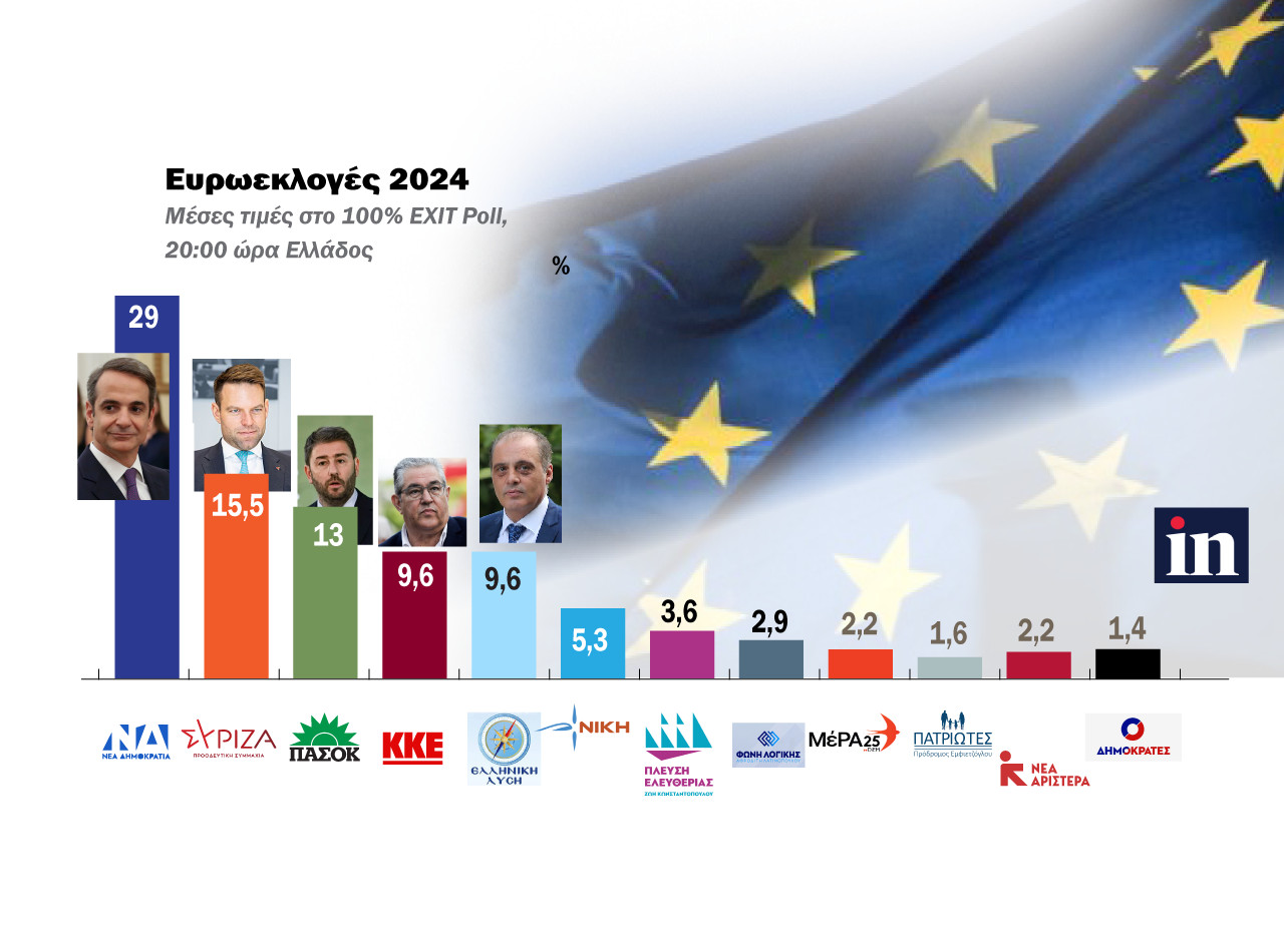 Σαφή νίκη της ΝΔ αλλά με ποσοστό σημαντικά κάτω του 33% από τις προηγούμενες ευρωεκλογές, πήχη που είχε θέσει ο ίδιος ο πρωθυπουργός, δείχνει το exit poll σε ποσοστό ενσωμάτωσης 100%.