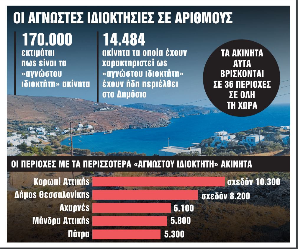 Σε πραγματικούς αριθμούς, οι περιοχές με τα περισσότερα «αγνώστου ιδιοκτήτη» ακίνητα είναι το Κορωπί Αττικής (σχεδόν 10.300), ο Δήμος Θεσσαλονίκης (σχεδόν 8.200), οι Αχαρνές (6.100), η Μάνδρα Αττικής (5.800) και η Πάτρα (5.300).