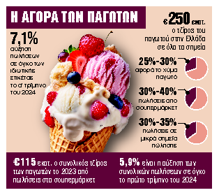 Την ίδια ώρα η συνολική αγορά παγωτού αποτιμάται στα 250 εκατ. ευρώ (εστίαση, περίπτερα και άλλα μικρά σημεία πώλησης, σουπερμάρκετ) και σύμφωνα με τους ανθρώπους της αγοράς οι προοπτικές είναι καλές και ενισχύονται από τις θετικές προσδοκίες για τον ελληνικό τουρισμό το φετινό καλοκαίρι. Μάλιστα, όπως λένε, παρά το γεγονός ότι οι αυξήσεις των πρώτων υλών, κυρίως του κακάου, επηρεάζουν τις τιμές, αυτό δεν αναμένεται να επηρεάσει σημαντικά τις πωλήσεις μιας και το παγωτό παραμένει μια φθηνή απόλαυση για τους καταναλωτές και εκτός σπιτιού μια αυθόρμητη αγορά.