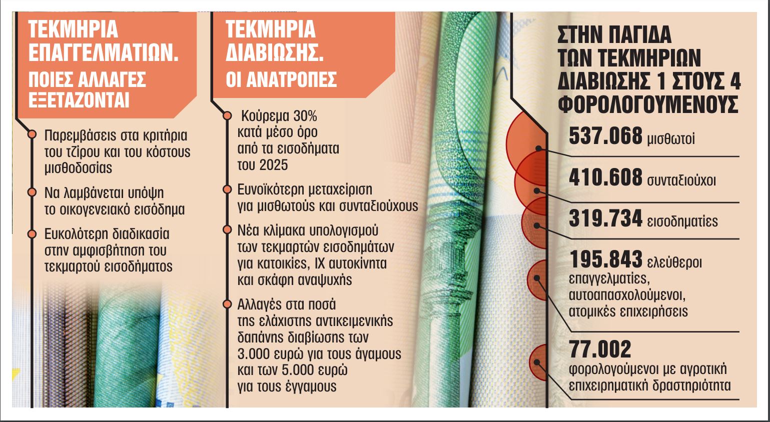 Το ριζικό λίφτινγκ στα τεκμήρια διαβίωσης θα συνοδεύεται με κούρεμα 30% μεσοσταθμικά από την 1η Ιανουαρίου 2025 και στόχος είναι η εξάλειψη των στρεβλώσεων και αδικιών που οδηγούν εκατοντάδες χιλιάδες πολίτες με χαμηλά εισοδήματα να πληρώνουν δυσανάλογα υψηλούς φόρους καθώς η Εφορία υπολογίζει τον φόρο με βάση τις τεκμαρτές δαπάνες που εφαρμόζονται για τη διαβίωση, τα αυτοκίνητα, τις κατοικίες, τις αγορές αγαθών, τα δίδακτρα σε ιδιωτικά σχολεία, τα σκάφη αναψυχής κ.ά.