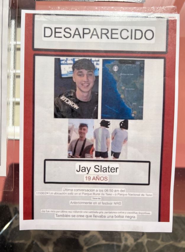 Ο Jay Slater εθεάθη για τελευταία φορά φορώντας ένα λευκό μπλουζάκι με βερμούδα και αθλητικά παπούτσια, με το τηλέφωνό του να δείχνει ως τελευταία τοποθεσία το πάρκο Ρουράλ ντε Τένο, μια περιοχή δημοφιλής στους πεζοπόρους.