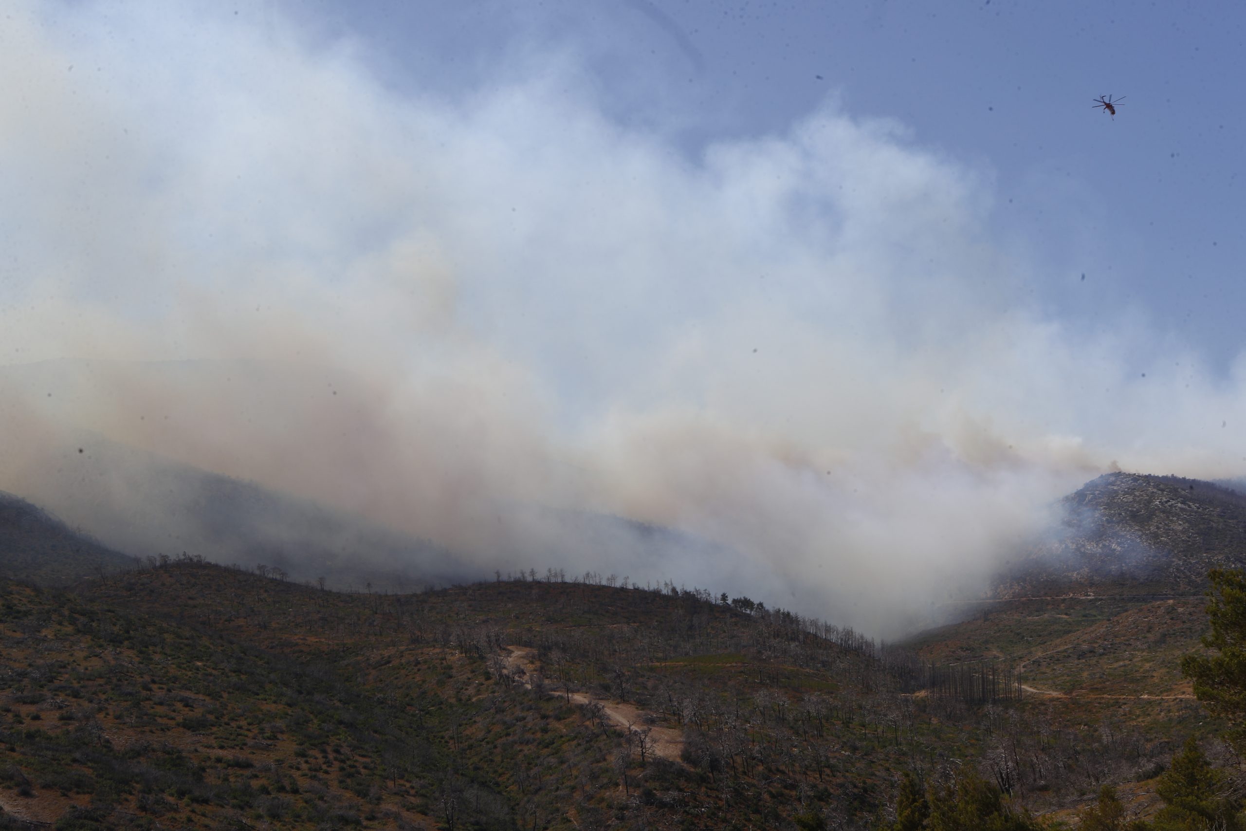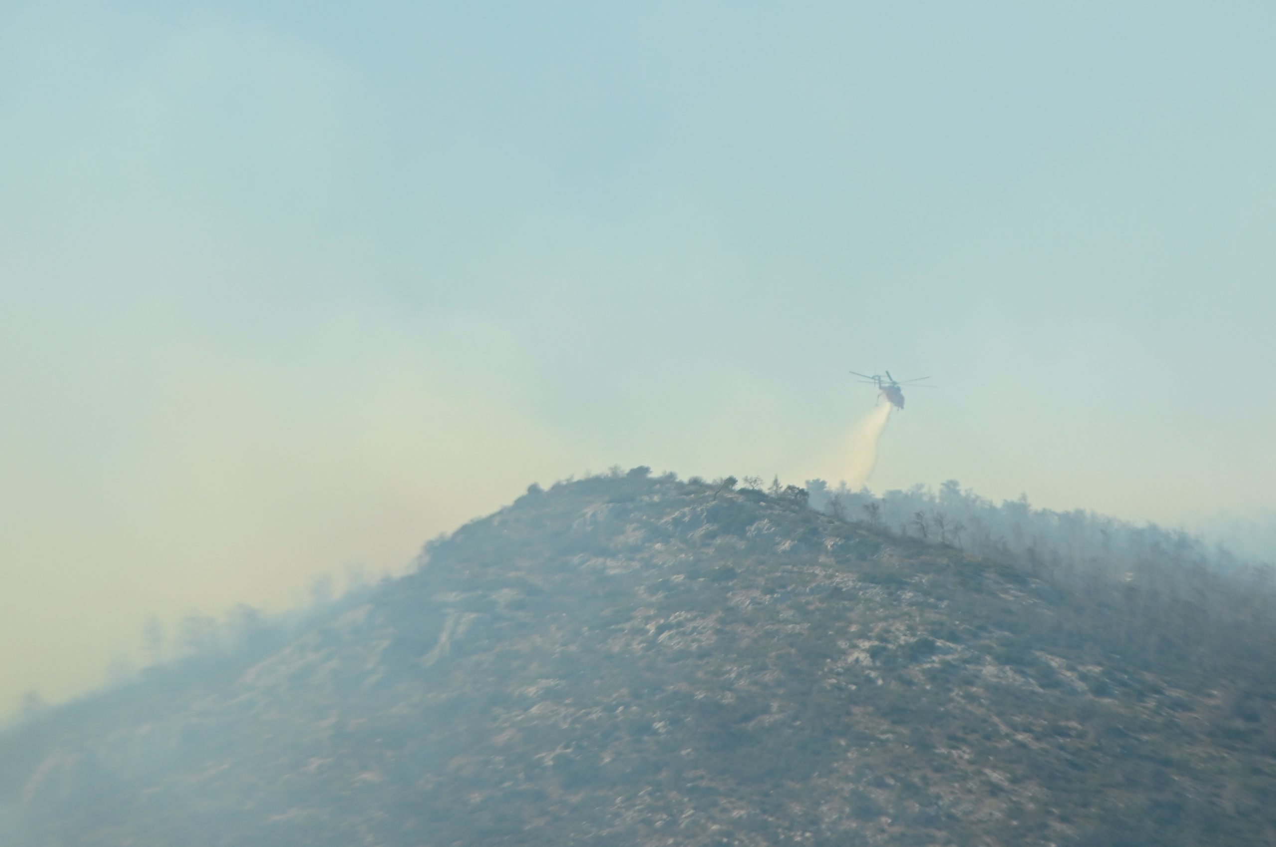 Επίσης, επιχειρούν 12 εναέρια μέσα, 4 αεροσκάφη και 8 ελικόπτερα. Στην περιοχή πνέουν ισχυρότατοι άνεμοι 50 χλμ. την ώρα, με ριπές που ξεπερνούν τα 100 χλμ. την ώρα, ενώ στην περιοχή υπάρχουν πυλώνες υψηλής τάσης, κάτι που δυσχαιρένει το έργο της κατάσβεσης, γι’ αυτό, όπως εξήγησε ο εκπρόσωπος της Πυροσβεστικής, «επιχειρούν κυρίως ελικόπτερα».