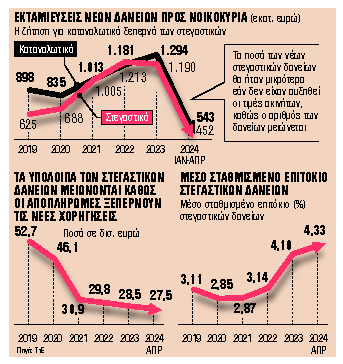 Στην ίδια κατεύθυνση κινείται η αναμενόμενη δεύτερη έκδοση του «Σπίτι Μου» και του «Ανακαινίζω – Νοικιάζω». Με τη συνέργεια κράτους και τραπεζικού τομέα, στόχος είναι οι εκταμιεύσεις των στεγαστικών δανείων να φτάσουν το 2024 τα 1,7 δισ. ευρώ έναντι 1,3 δισ. για το 2023, αλλά και να «διορθώσουν» την ανισορροπία που υπάρχει μεταξύ στεγαστικών και καταναλωτικών δανείων (55% καταναλωτικά, 45% στεγαστικά το α’ τρίμηνο του 2024). Ταυτόχρονα, οι τράπεζες εντείνουν τις προσπάθειές τους για γρηγορότερη επεξεργασία των αιτημάτων, με διαδικασίες fast-track στην εκταμίευση του δανείου, ενώ απαλλάσσουν τους δανειολήπτες από τις δαπάνες εξέτασης των αιτήματος.