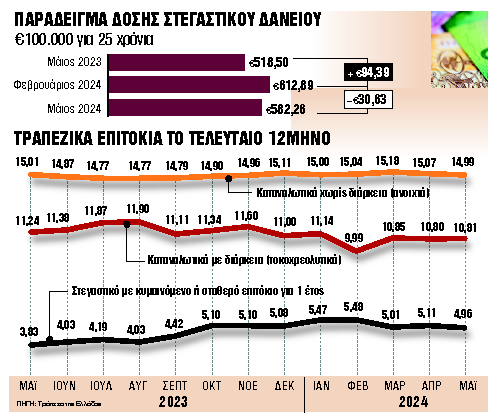 Στη μείωση των επιτοκίων στα στεγαστικά δάνεια συνέβαλε και η υποχώρηση του διατραπεζικού επιτοκίου euribor, μετά την κίνηση της ΕΚΤ, αλλά και των αποδόσεων των ελληνικών ομολόγων που αποτελούν τη βάση για την τιμολόγηση των στεγαστικών δανείων με σταθερό επιτόκιο, μεγαλύτερης διάρκειας. Ωστόσο, τον Ιούνιο, οι εξελίξεις από τη Γαλλία επηρέασαν ανοδικά τα επιτόκια στη διατραπεζική και στα ομόλογα. Ο βαθμός που μπορεί αυτή η εξέλιξη να επηρέασε τα τελικά επιτόκια για τα νοικοκυριά θα φανεί τον επόμενο μήνα.