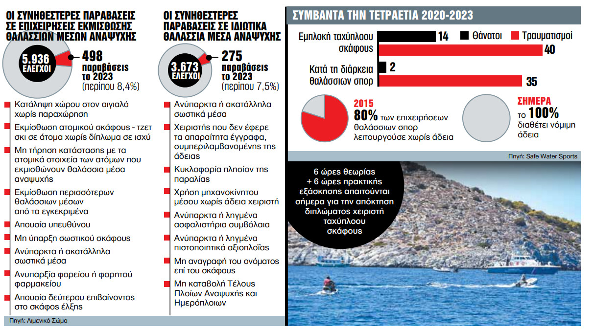 Οπως εξηγεί η υπεύθυνη Δημοσίων Σχέσεων της Safe Water Sports Ελίζα Καραμπετιάν-Νικοτιάν, το 2015 το 80% των επιχειρήσεων θαλάσσιων σπορ λειτουργούσε χωρίς άδεια. Σήμερα, όπως τονίζει, το 100% διαθέτει νόμιμη άδεια και ελέγχεται από το Λιμενικό. Δεν παύουν ωστόσο να υπάρχουν και παραβατικοί επιχειρηματίες, γι’ αυτό και καλεί τους πελάτες να απαιτούν οι ίδιοι την εφαρμογή της νομοθεσίας, αξιοποιώντας την ψηφιακή εφαρμογή της οργάνωσης στην οποία βρίσκονται αναρτημένες οι σχετικές διατάξεις. Σύμφωνα με επίσημα στοιχεία του Λιμενικού Σώματος, το 2023 πραγματοποιήθηκαν 5.936 έλεγχοι σε επιχειρήσεις εκμίσθωσης θαλάσσιων μέσων αναψυχής και βεβαιώθηκαν 498 παραβάσεις. Την ίδια χρονιά πραγματοποιήθηκαν 3.673 έλεγχοι σε ιδιωτικής χρήσης θαλάσσια μέσα αναψυχής (ταχύπλοα κ.λπ.) και βεβαιώθηκαν 275 παραβάσεις.