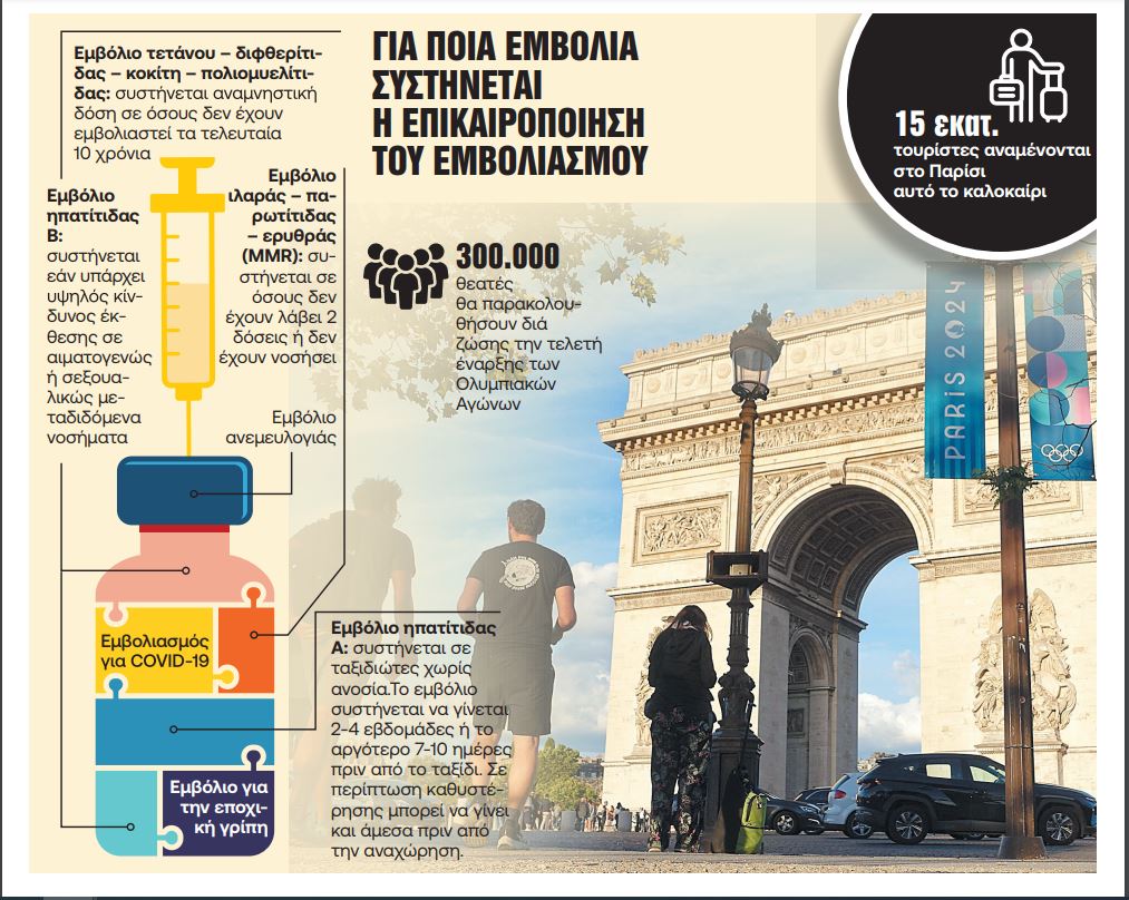 Αντίστροφα μετράει ο χρόνος για την έναρξη των Ολυμπιακών Αγώνων, με το Παρίσι να βρίσκεται στο επίκεντρο των πιο δημοφιλών τουριστικών προορισμών εφέτος το καλοκαίρι. Οσοι όμως έχουν ήδη προγραμματίσει να επισκεφθούν την Πόλη του Φωτός θα πρέπει να επικοινωνήσουν με τον γιατρό τους ώστε να ενημερωθούν για απαιτούμενα εμβόλια και φάρμακα αλλά και να εφοδιαστούν με τα απαραίτητα μέσα προφύλαξης – από αντηλιακά και καπέλα έως εντομοαπωθητικά και αντισηπτικό χεριών.