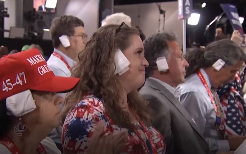 Οι ψεύτικοι επίδεσμοι άρχισαν να εμφανίζονται στα αυτιά την Τετάρτη και γρήγορα σάρωσαν το συνεδριακό κέντρο σχηματίζοντας μια θάλασσα από έξτρα λευκά τετράγωνα ακουμπισμένα σε αυτιά. Ορισμένοι μάλιστα προσαρμόζουν τα επιθέματα τους με συνθήματα όπως «T 2024» και το εντελώς φυσιολογικό και καθόλου ανησυχητικό για αυτούς «FIGHT FIGHT FIGHT FIGHT».